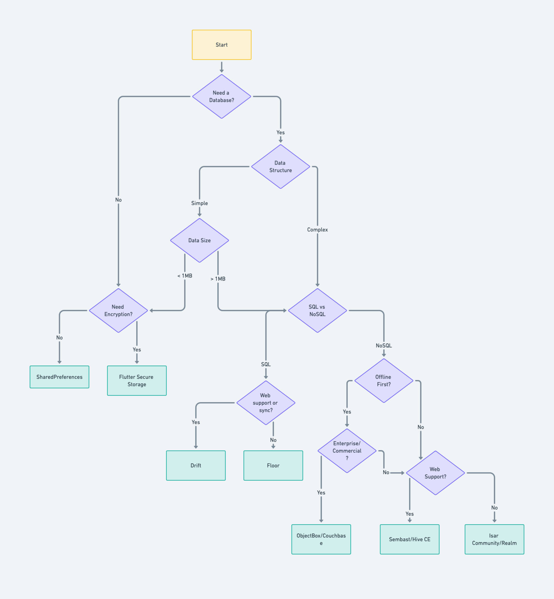 Before diving into database options, consider if you actually need one. For simple data storage needs, consider these alternatives an alternative like SharedPreferences or just an in-memory storage.